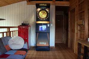 - 2階に上がると、廊下がフリースペースになっていて、ソファと本格的なダーツマシンが置かれています。